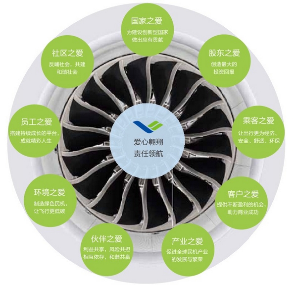 中国商飞公司将社会责任理念融入企业发展战略,明确将履行社会责任定位为企业经营的发展重点之一,并从企业文化、社会责任管理体系、社会责任工作体系、社会责任报告制度、社会公益事业等五个方面进行具体工作部署。